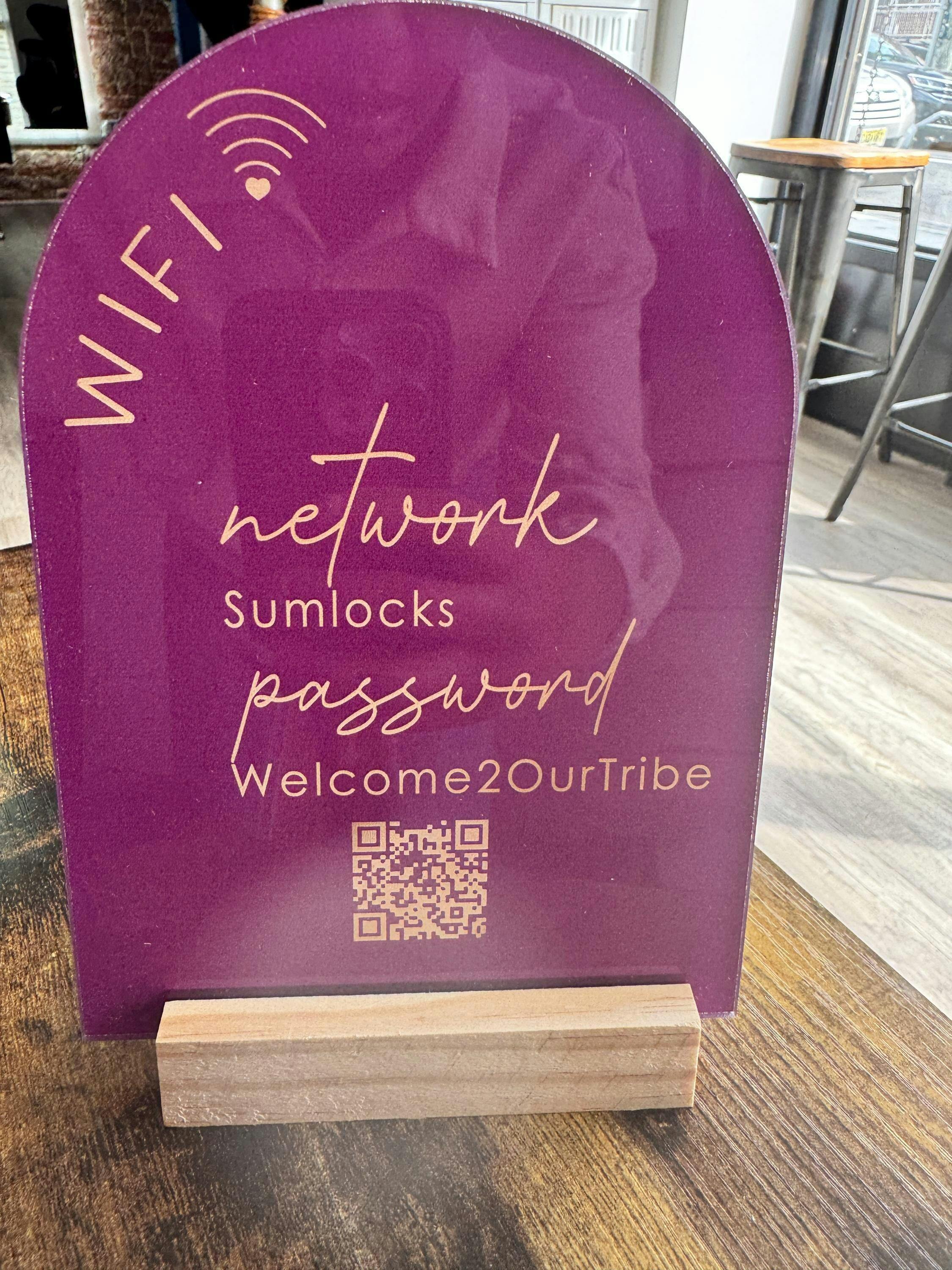 Our Acrylic Home Wifi Sign is the perfect way to display your network name and network password. The Acrylic sign measures 7" tall x 5" wide and comes with a natural wood stand.