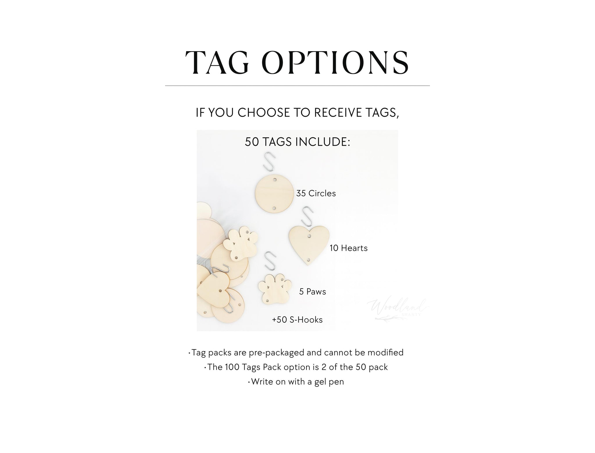 • You can choose to receive no tags with the sign, or a 50 pack which includes 35 circles, 10 hearts, 5 paws and 50 S-hook Connectors. Tags made of natural wood and are 1.5”. Gel pens work best for writing on them (not included).